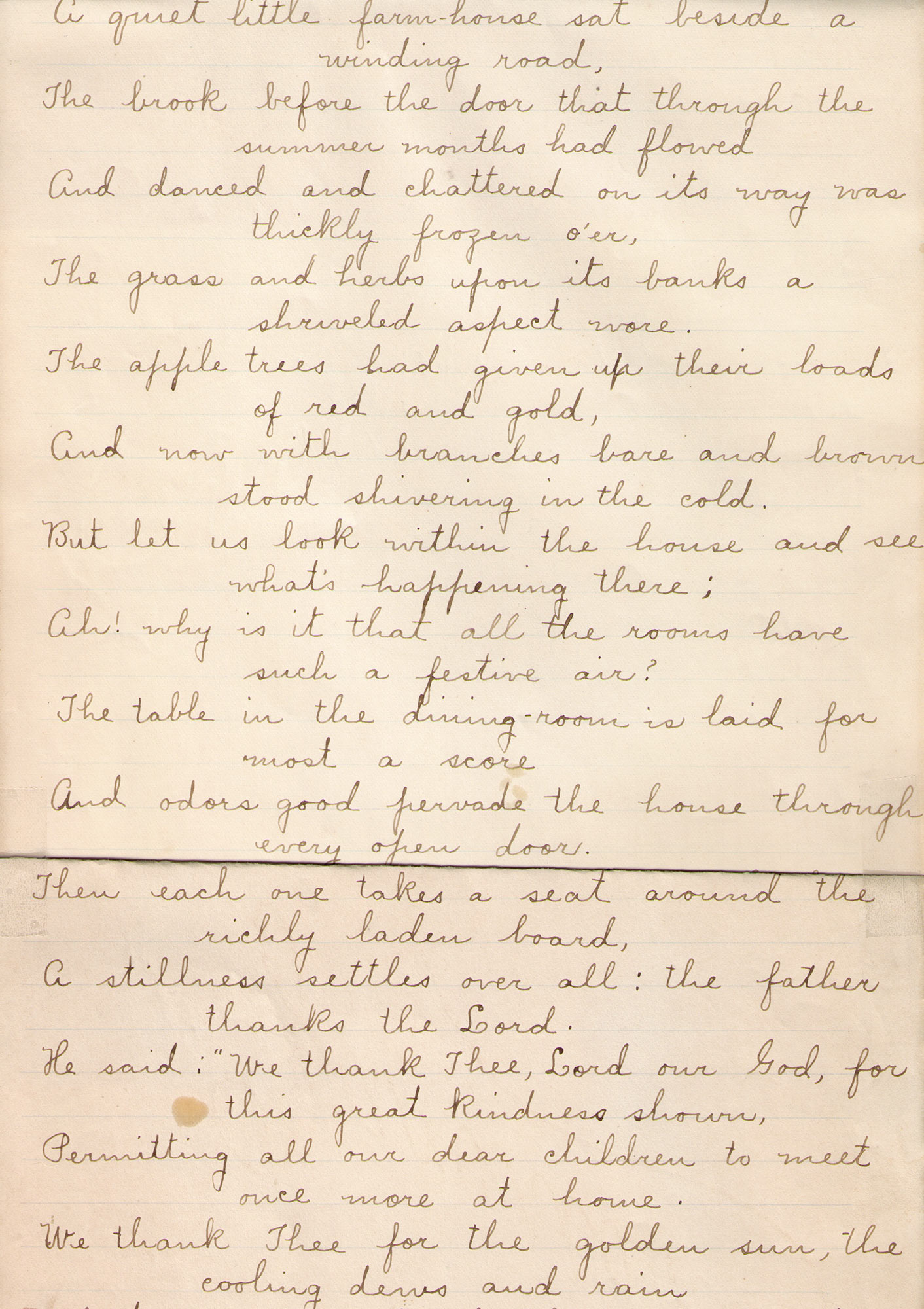 Of the prose and poems mentioned in part one I am almost certain now that they are all creations of my grandmother. Two of the poems are timely because they are about Thanksgiving and one of the prose pieces is quite humorous: “How a Married Man Sews on a Button!” The prose piece will be saved for a future article as it is quite lengthy. A combination of the Thanksgiving Day poems appears above in my grandmother’s beautiful handwriting. The two seem to go together as one long poem but with part of one missing. We can catch the nostalgic flavor that Grandma wanted to convey—something that most of us will miss this year with Covid in the air. The end of the poem reads: