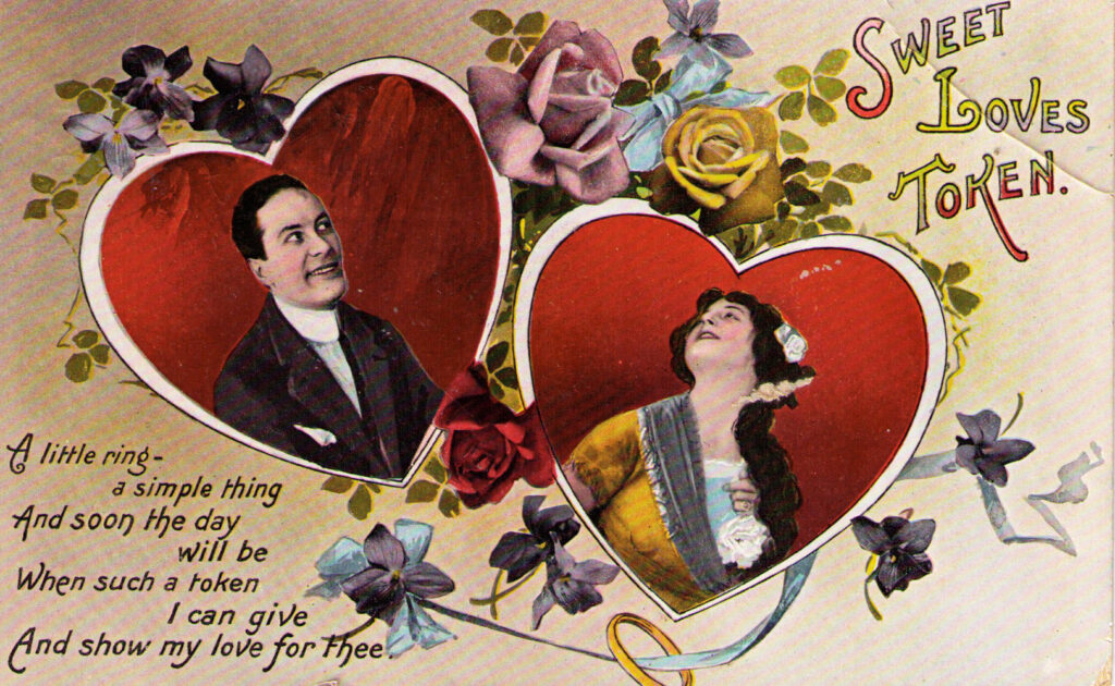 Of all the 28 postcards my favorite is one that was sent on July 31, 1914 to my grandmother, Hannah (Sechler) Hagenbuch, before she was married to my grandfather, Clarence Charles Hagenbuch on November 25th of the same year. The colorful card depicts a man and woman surrounded by hearts with the title “Sweet Loves Token.” The accompanying verse speaks to the importance of a ring, simple yet important, as a token of love. The sender wrote to my future grandmother: “Don’t forget to show this to C. when he comes. Guess Who.”