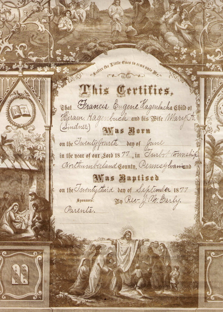 My great uncle, Francis Eugene Hagenbuch (b. 1877, d. 1913), has had several articles written about him. One of the earliest was the story of his death and how his widow, Gertrude (Robbins) Hagenbuch, only received one silver dollar from the estate of her mother-in-law, Mary Ann (Lindner) Hagenbuch. Francis Eugene’s story is a sad one, and my Uncle Perce and my father’s first cousins—Bruice, Andrew and Julia—often talked about him. I always had the feeling that they expected he would have made something of himself if he hadn’t married “that Robbins girl” and died young. I am in possession of a document which “certifies” Francis’s birth and baptism. He was born June 24, 1877 in Turbot Township, Northumberland County, PA and was baptized on September 23, 1877 by Rev. J. M. Early. It’s a standard document, printed in Philadelphia, that was used by churches when a child was baptized. It is probably not too special to most folks, but knowing “Uncle Gene’s” story, it means a lot to me.