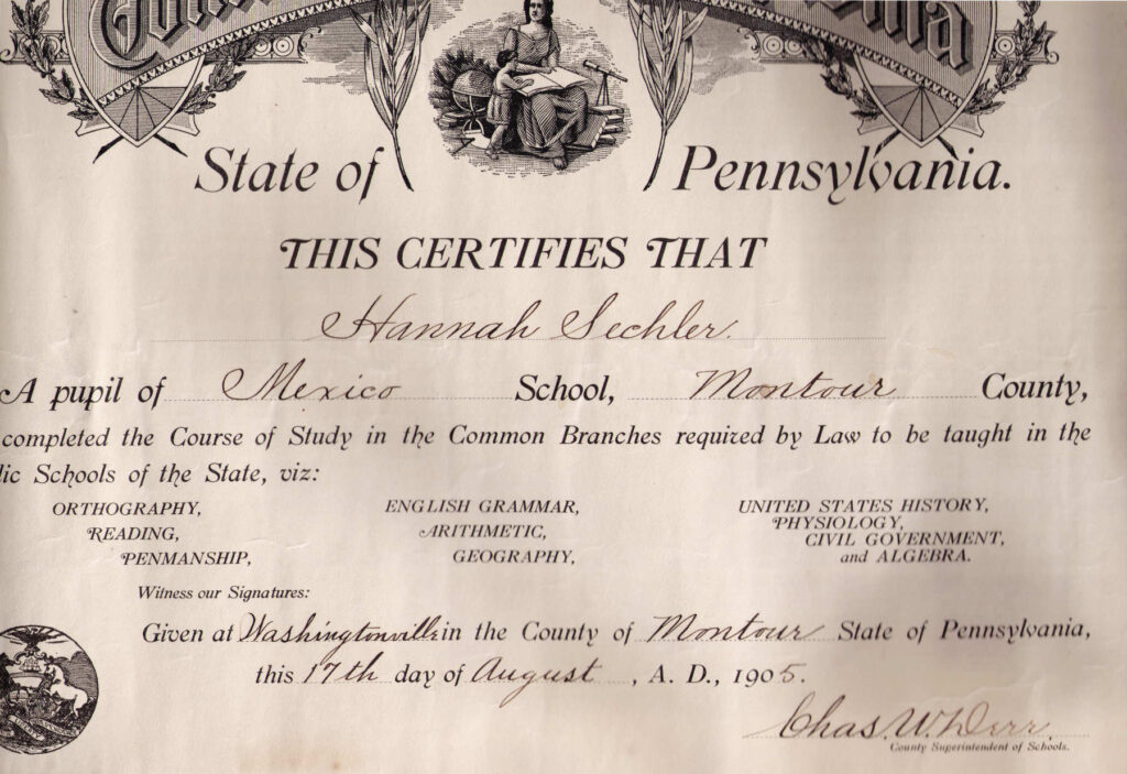 Those of us familiar with Montour County, Pennsylvania where Grandma and most of my Hagenbuch family lived know that the “Mexico” referred to is not the country! Rather, it is an area between Washingtonville, PA and Pottsgrove, PA where my Hagenbuch and Sechler families lived. Once again, as with Uncle Gene’s birth and baptismal certificate, this document may not mean much to others, but I know that it meant a lot to Grandma and to her parents (whom I have written about)—Samuel and Mary (Davis) Sechler. One interesting piece of this document is an attached frayed blue ribbon, suggesting that Hannah Sechler was an excellent student.