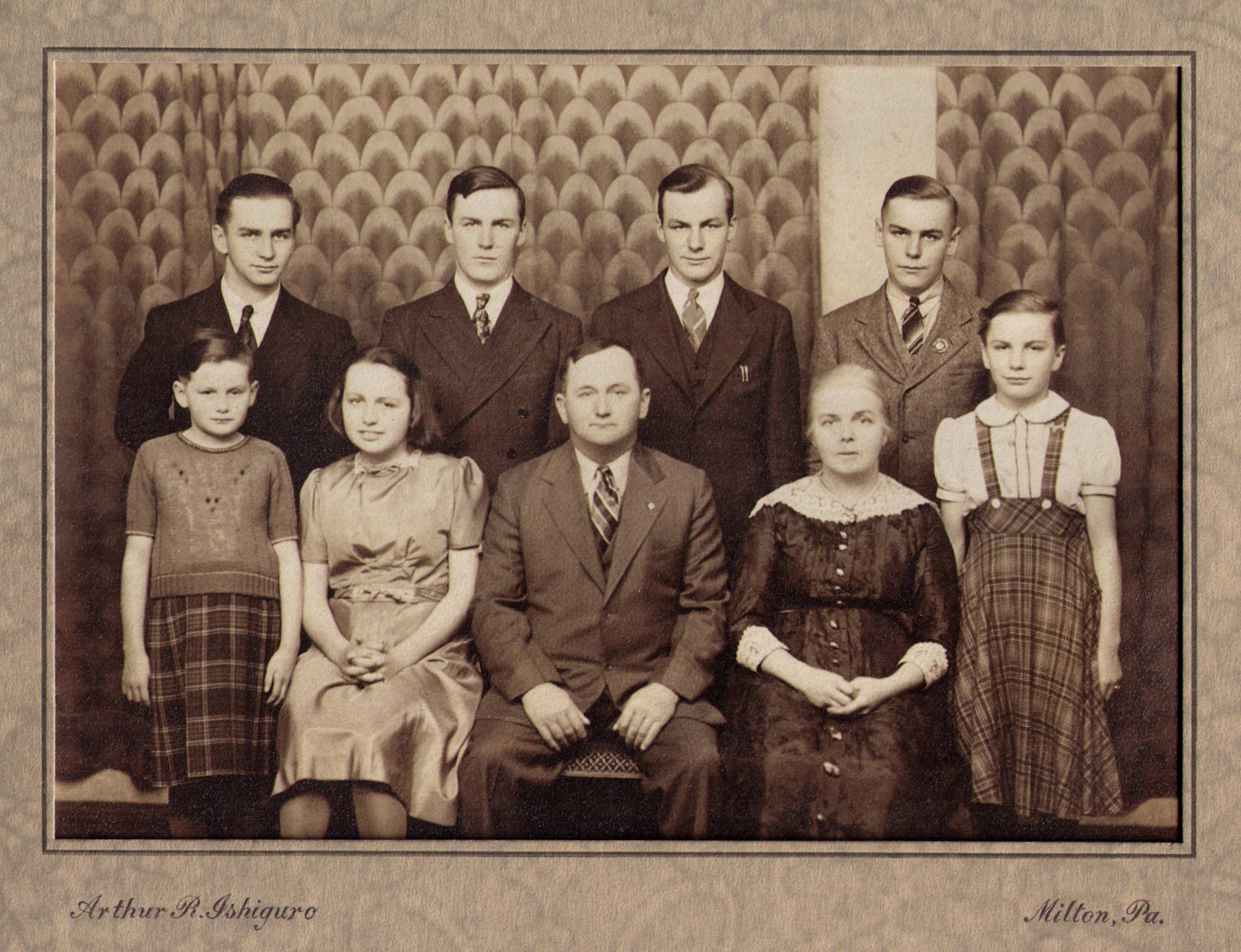 Clarence and Hannah (Sechler) Hagenbuch’s family, 1939. Top Row: Charles, Homer, Wilmer, and Lee. Bottom Row: Mary, Florence, Clarence, Hannah, and Ellen