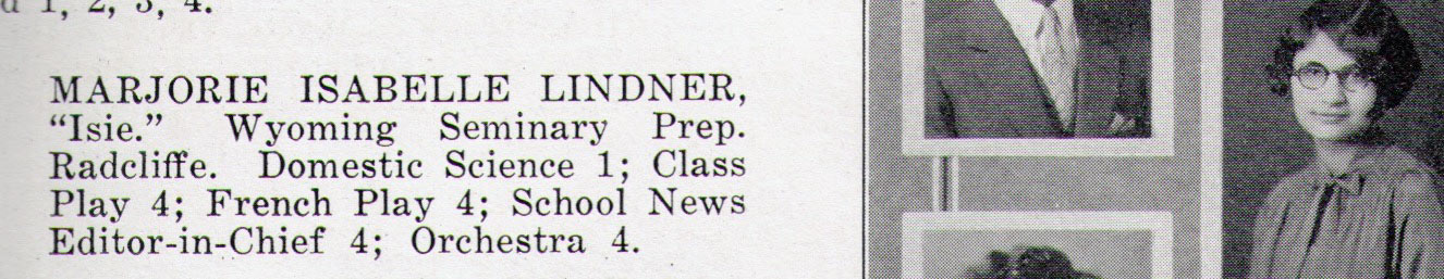 Taking a chance, I looked through the underclassmen lists for other Lindners and found Alice Lindner in the class of 1927. Alice was another grand daughter of Francis Walter Lindner and was a first cousin to Marjorie. Marjorie’s father, James Lindner, was a brother to Alice’s father, Lee Lindner. Marjorie and Alice shared a great grandfather, Israel Lindner, with my father Homer. Like Ethel and Ella Bibby they were second cousins to my father.