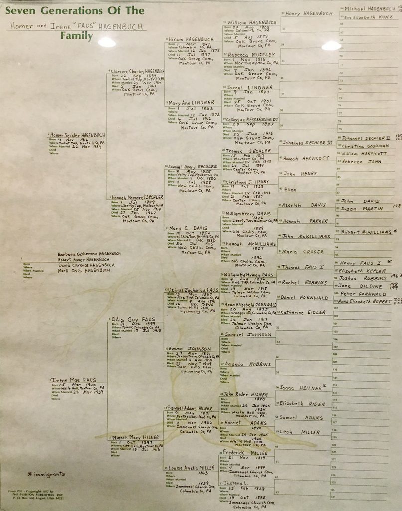 The white blind would be unrolled at our family reunions displaying the names of William (b. 1807) and Rebecca (Muffley) Hagenbuch (b. 1816) on the tree roots. Rising from the roots was the trunk of the tree with four large branches containing the names of the four of their seven children who had families: Mary Ann (Hagenbuch) Foust, Hiram Hagenbuch, Joseph Hagenbuch, and Emma (Hagenbuch) Reichard. From each of those branches were smaller branches listing their children, and from those were even smaller branches and then leaves. My name, Mark Hagenbuch, was on one of the leaves.