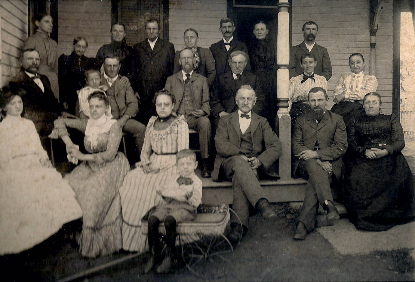Second Row (left to right): Lizze (Reichard) Poust (daughter of Elias Reichard and step-daughter of Tillie Hagenbuch Reichard), Jennie (Houck) Keller (daughter of Harriet Houck), Elmira Emmitt (sister of the deceased), Andrew Beagle (widower husband of Ellen Reichard). Behind Andrew is Emma (Hagenbuch) Reichard and to the left of her, in the doorway, is Clara (Hagenbuch) Reichard, daughter-in-law of the deceased. In the very back left (in front of the windows) is Robert Lawson, husband of Lula in the front row. To the right of Robert is Jasper Poust, husband of Lizzie (Reichard) Poust.
