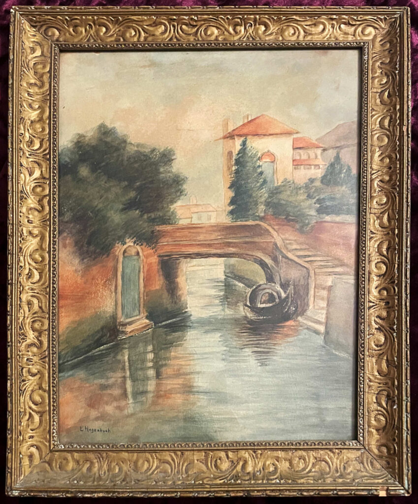 In August of 2024, my father, Mark, and I received information about an unidentified Hagenbuch artist. A woman named Katie sent us a message through Facebook and described a unique watercolor painting that she had found at a thrift store in Glenville, New York—a small town northwest of Albany. She provided a number of photographs of the painting too. The framed picture depicts what may be a view of Venice, Italy, complete with a gondola boat floating on a canal under a bridge. The painting is tastefully done and exhibits the skill of someone who has been practicing their craft for some time. The artist signed signed their name “L. Hagenbuch” and placed the watercolor in a gilt frame. Judging from the age of the frame and paper, it may have been painted in the early 20th century. Who was L. Hagenbuch? Katie, my father, and I all wanted to know.