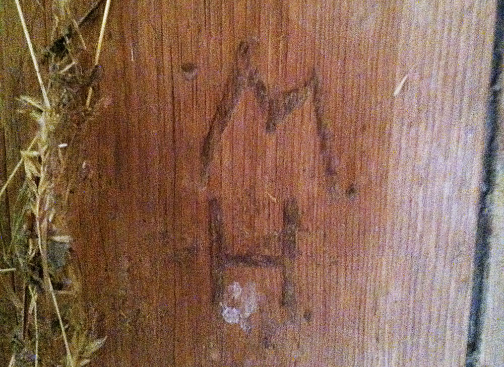 The owner told us to roam all we wanted, explore, and enjoy the memories. He would be back later. My tape measure, paper and pencil were kept busy for the next hour as Tom and I tramped all over, inside and outside the buildings. When we got to the stable doors, sure enough there were several sets of my initials, fifty plus years after being carved. We also found another treasured carving.