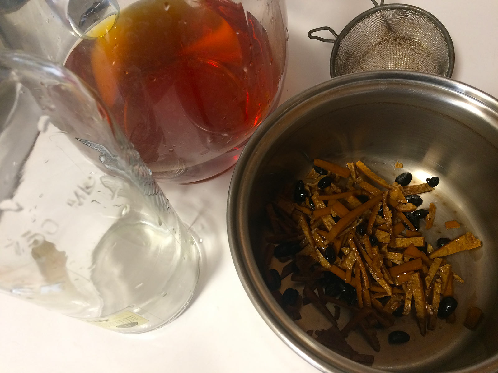 A few weeks ago, I pulled my ripened bottle of Forty-Nine Beans from the cupboard. Using a large pitcher and a sieve, I strained the contents of the bottle. Then, I washed out the bottle and poured the dark, amber liquid back into the bottle with the help of a funnel. Finally, I picked out the 49 coffee beans from the strained materials, added the beans back into the bottle, and discarded the orange rind.