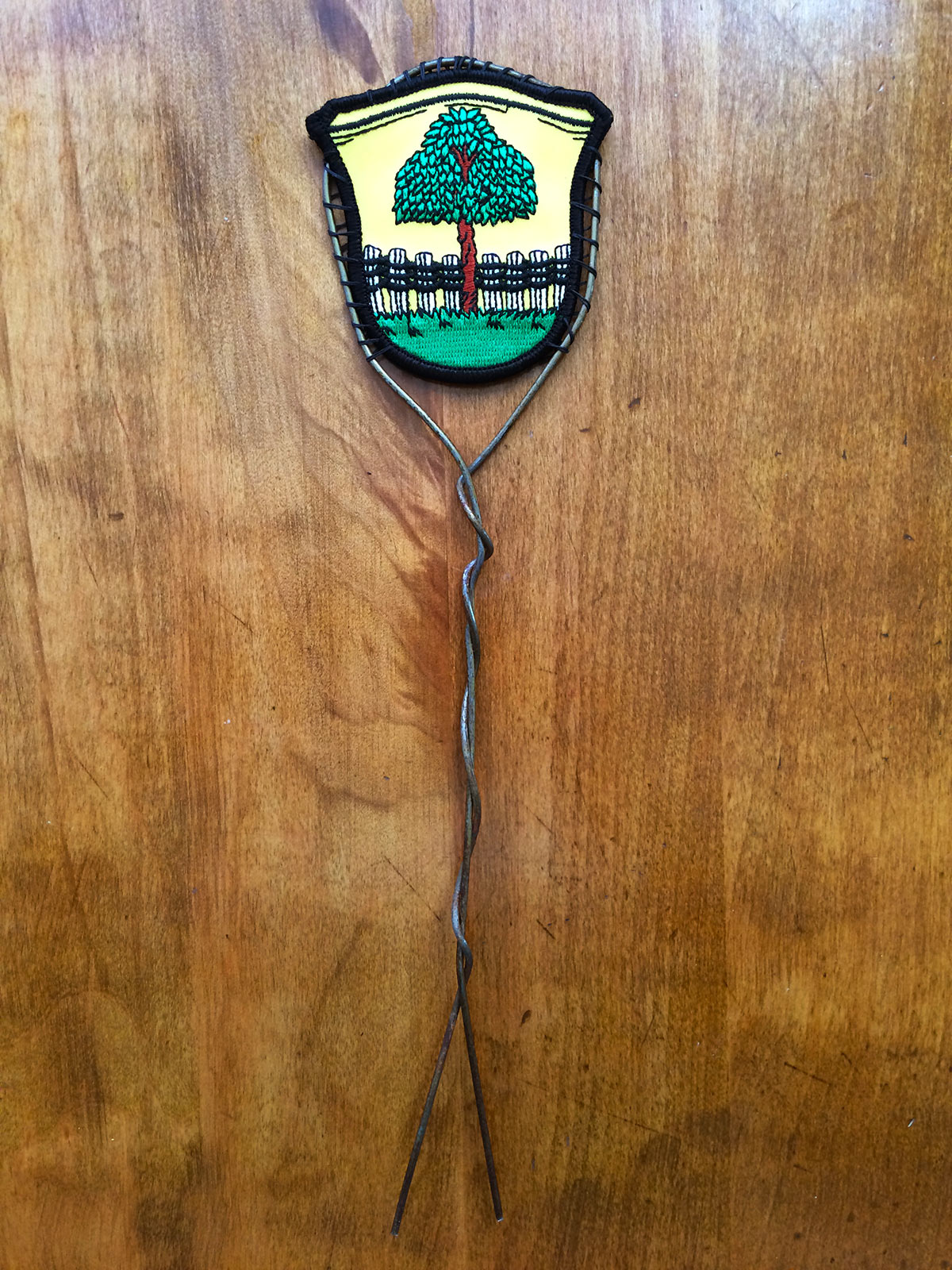 Lastly, use the needle and thread to sew the edges of the patch onto the wire loop. The entire edge of the patch doesn’t need to be sewn onto the wire. Instead, start in the lower left corner of the patch and sew in a clockwise direction until reaching the patch’s lower right corner. You will now have a Hagenbuch coat-of-arms patch at the end of a wire stake that can be pushed into the ground.